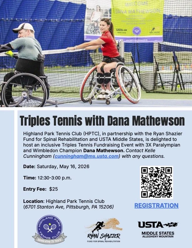 HPTC, in partnership with the Ryan Shazier Fund and USTA, is excited to host an inclusive Triples Tennis fundraising event focused on community and connection. Players will compete in mixed triples teams, with Dana Mathewson—3x Paralympian and Wimbledon Champion— rotating across courts to play with everyone.